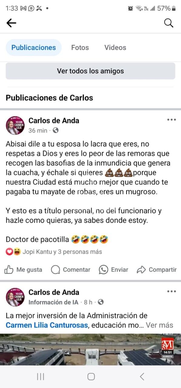 “En días pasados el director de Obras Públicas hizo una publicación en su red social Facebook, en donde hace un señalamiento en contra de mi persona e incluso menciona a mi esposa.