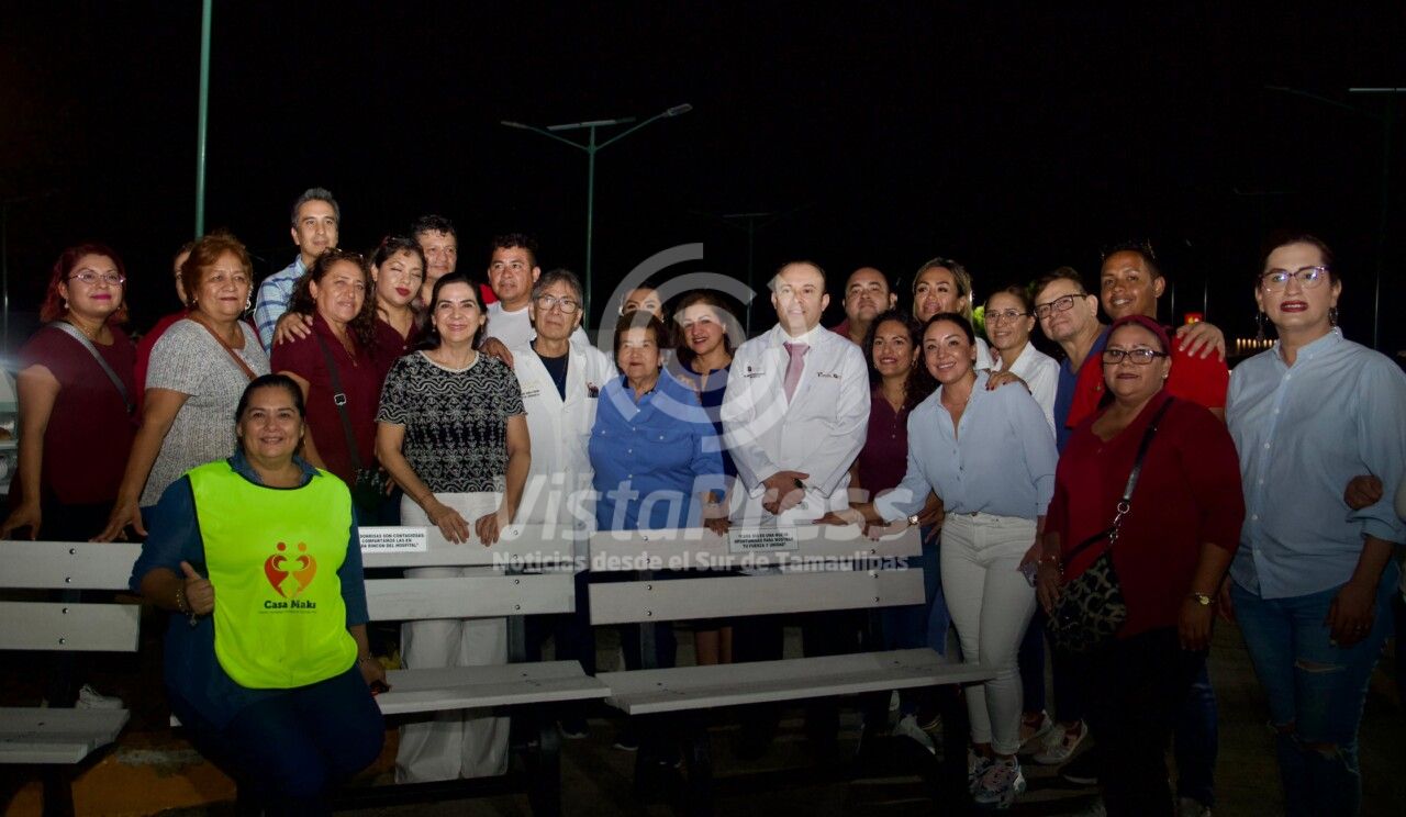 Tampico, Tam.-Mónica Villarreal Anaya, alcaldesa electa de Tampico en coordinación con el Centro contra el Cáncer Infantil «Casa Maka», hicieron la entrega de bancas ecológicas al Hospital de Especialidades IMSS-Bienestar «Dr. Carlos Canseco».