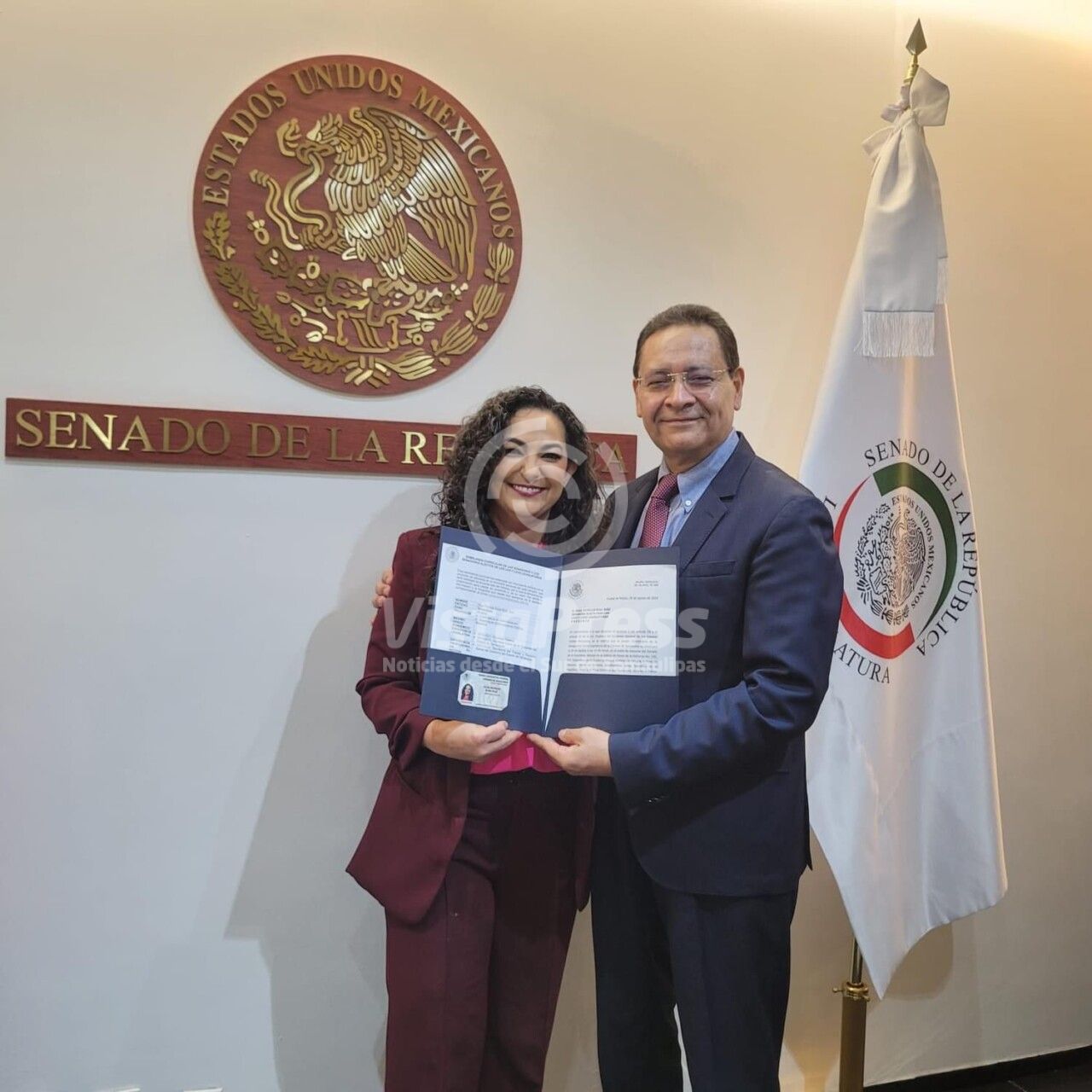 En Ciudad de México, la senadora electa por Tamaulipas Olga Sosa, recibió su credencial y pase para la sesión constitutiva del próximo 29 de agosto en el Senado de la República, de manos del secretario general de Servicios Parlamentarios Arturo Garita Alonso.