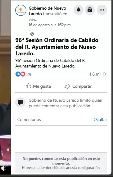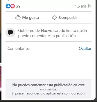 Suele restringir las publicaciones de la página del Gobierno municipal para que nadie pueda comentar y, de esta forma, no tiene retroalimentación, pues elimina la comunicación con el ciudadano.