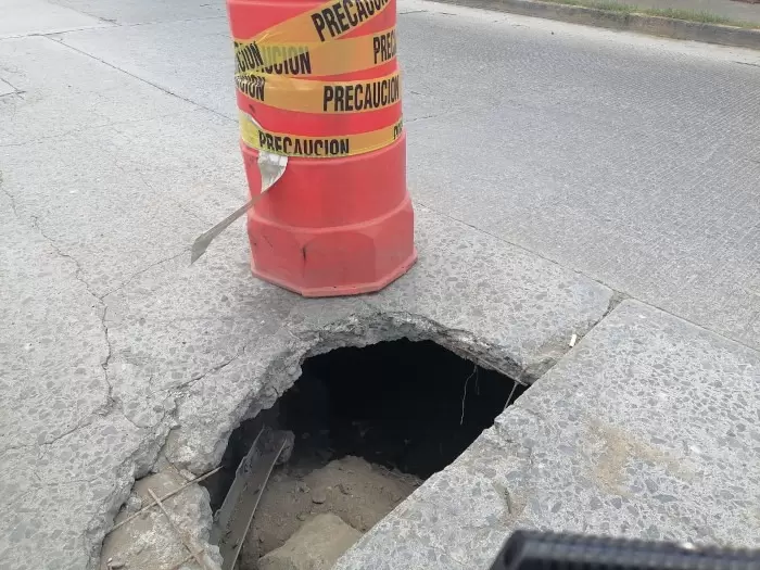 El hoyo, de aproximadamente un metro por 50 centímetros, representa un riesgo considerable para los conductores. A simple vista, parece un pequeño pozo, pero bajo la superficie se extiende una caverna debido a la falta de tierra que soporte la capa de la calle. Aunque la zona ha sido señalada con un bote de plástico naranja, el área afectada es más extensa y obliga a los conductores a maniobrar cuidadosamente para evitar accidentes.