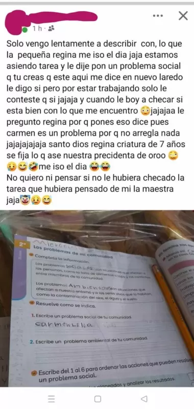 Nuevo Laredo, Tamaulipas, 23 de septiembre de 2024 .— Una tarea escolar reveló lo que muchos adultos ya saben, pero pocos se atreven a expresar: la ineptitud de la alcaldesa de Nuevo Laredo, Carmen Lilia Canturosas. Una niña de 7 años, con la honestidad propia de su edad, dejó claro en su libro de tareas que el verdadero problema de su ciudad es, sencillamente, «Carmen».