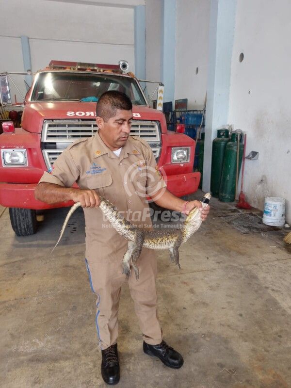 Tampico.- Un cocodrilo de aproximadamente un metro de largo fue encontrado este martes debajo de un automóvil en calles aledañas a la laguna del Carpintero mismo que fue atrapado por bomberos de Tampico y devuelto a su hábitat.