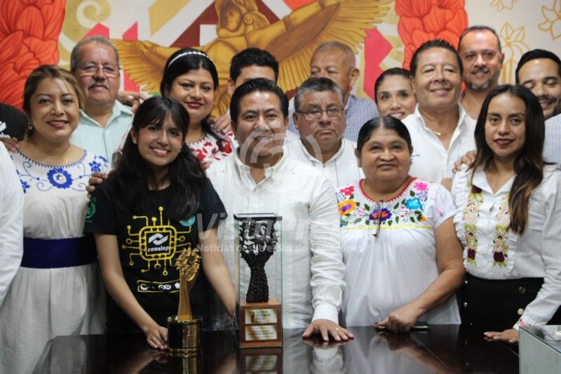 Acompañada de familiares, amigos, y sus maestros del Conalep 244 Manuel Maples Arce, la galardonada a nivel mundial con un reconocimiento que se equipara con el Nobel de Educación, fue recibida en Sala de Cabildo de Papantla por el alcalde Eric Domínguez y los integrantes de su comuna.