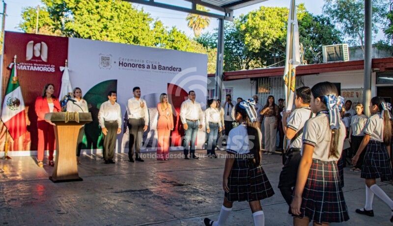 Matamoros, Tamaulipas.- En un acto de compromiso y respeto a los símbolos patrios, el alcalde Alberto Granados Fávila encabezó los honores a la bandera en la Esc. Primaria México Agrario del ejido del mismo nombre. Durante la ceremonia, el presidente municipal resaltó la importancia de fortalecer los valores cívicos en las nuevas generaciones y reafirmó el apoyo del Gobierno Municipal a la educación.