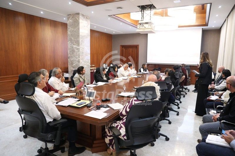 Durante la reunión, celebrada en el nuevo salón “Benito Juárez” del Palacio de Gobierno, conoció los avances de la obra de la segunda línea del Acueducto Victoria, el estatus del Puerto Seco (Recinto Fiscal en Ciudad Victoria), el Par Vial sobre el Río San Marcos, el Puerto del Norte en Matamoros, entre otros proyectos que le presentaron las y los secretarios estatales.