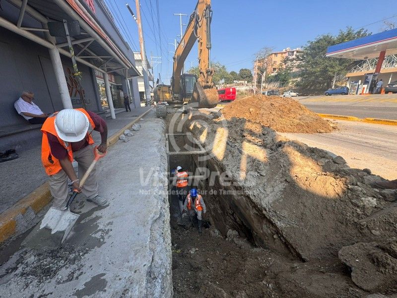Tampico, Tam.- Beneficiando a las familias que habitan en importante sector de Ciudad Madero, así como al comercio establecido en un tramo de las principales vialidades de este municipio, COMAPA SUR trabaja en la rehabilitación de una línea general de drenaje.