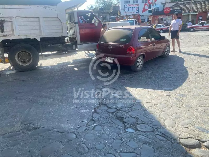 Tantoyuca, Ver.-Aparatoso percance vial se registró en la zona centro de Tantoyuca, ya que el conductor de una unidad compacta salio sin precaución de una gasolinera, impactándose contra un camión materialista.