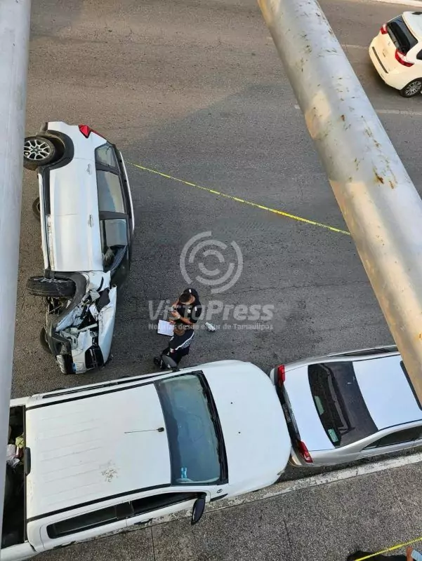 Tampico, TAM.- Jovencito de 16 años que venía a exceso de velocidad sobre el boulevard Adolfo López Mateos en Tampico dormita y se estrella contra una patrulla de Tránsito y otras tres unidades más, quedando volcando frente a la UAT.