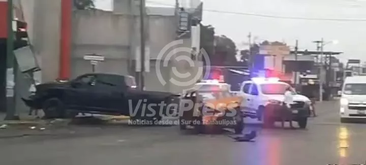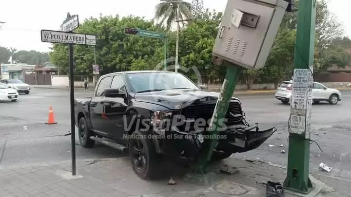 Ciudad Madero, Tam.- La madrugada de este viernes se registró un aparatoso accidente vial en la colonia Unidad Nacional, luego de que un conductor en presunto estado de ebriedad perdiera el control de su camioneta y se impactara contra otro vehículo y la estructura metálica que sostiene el sistema de semáforo.