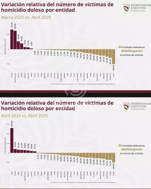 Gracias a la coordinación y colaboración del Gobierno del Estado con el Gobierno Federal, el reporte señala que Tamaulipas redujo 6.2% la tasa de víctimas de homicidios dolosos respecto a marzo de 2025, y lo disminuyó un 55.9% en relación al mes de abril de 2024.
