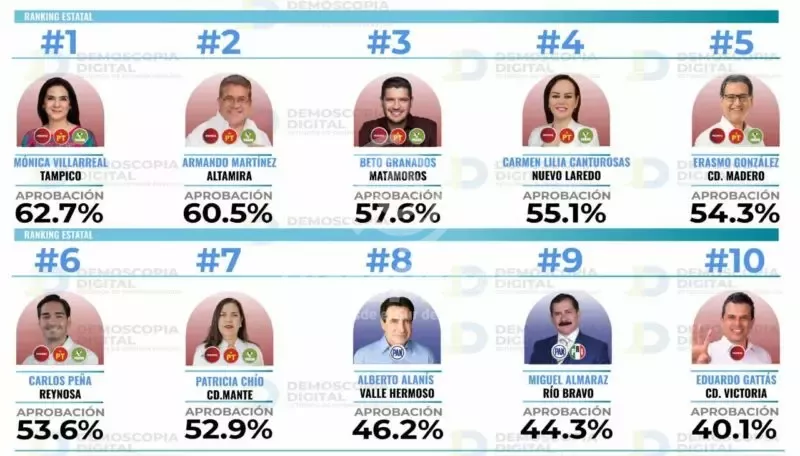 Cabe precisar que la encuesta sitúa en segundo lugar a Armando Martínez Manríquez, presidente municipal de Altamira, quien registra una aprobación del 60.5 %, seguido de Beto Granados en Matamoros, con 57.6 %. El común denominador entre los primeros lugares es la alianza partidista Morena-PT-Verde, lo que sugiere una preferencia sostenida de la ciudadanía hacia el proyecto de la Cuarta Transformación en el sur y norte del estado.