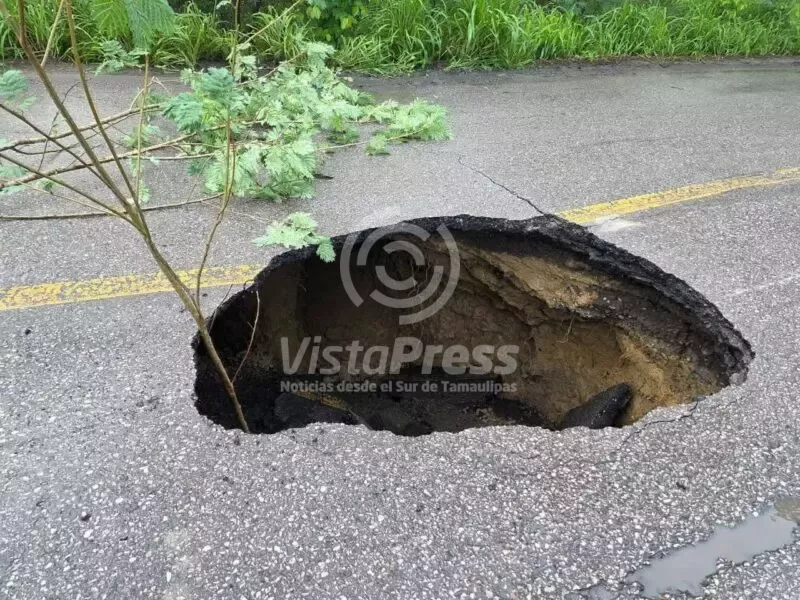 Por ello se alerta y pide extremar precauciones al conducir por la formación de enorme socavón en el tramo carretero San Sebastián – Tantoyuca, de la carretera federal Alazán – Canoas.