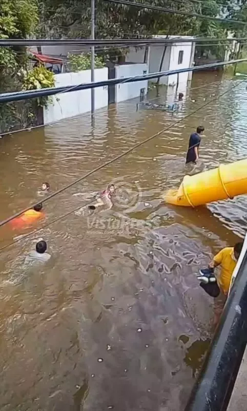 Tampico, Tam.- Y reza un dicho por ahí que “al mal tiempo, buena cara” y es así como los habitante de la colonia Vicente Guerrero, sector Moscú en Tampico, están completamente disfrutando de unas vacaciones con toboganes y alberca incluida en sus calles y se dan el tiempo para jugar voleibol y aventarse un chapuzon.