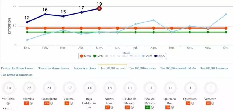 Con un promedio mensual de apenas 9 casos por cada 100 mil habitantes, la entidad gobernada por Américo Villarreal Anaya se ha mantenido por debajo de la media nacional y muy por debajo de entidades con focos rojos persistentes como Guanajuato o la Ciudad de México, donde la incidencia mensual de extorsión duplica e incluso triplica los niveles de Tamaulipas.