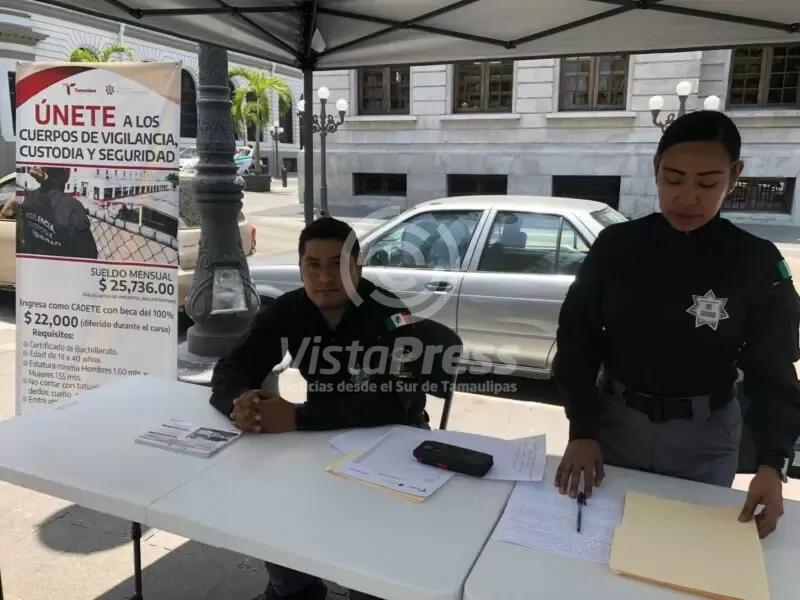 “Continuamos en la búsqueda de personas interesadas en ser parte de las filas de la Guardia Estatal como cuerpos de custodia en los Cedes, es por ello que instalamos este módulo aquí en la plaza de armas de Tampico, la cual estará a partir de este hoy y hasta el próximo viernes para seguir reclutando a hombres y mujeres interesados en este puesto donde pueden llegar a ganar hasta 25,736 pesos, como sueldo mensual”, expresó.