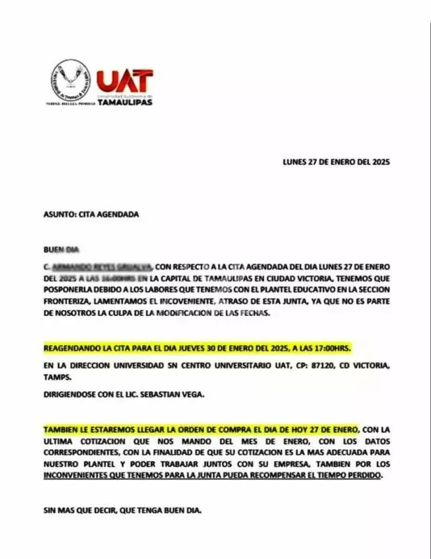De inmediato, del área administrativa de la UAT recibió una cita para el 25 de enero con el objeto de entrevistarse en Ciudad Victoria con un funcionario de nombre Sebastián Vega, para fecha del 30 de Enero en punto de las 17:00 horas, es decir, fuera de horario laboral.