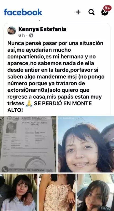 En la publicación también se muestra lo que parece ser un boletín oficial emitido por la Fiscalía General de Justicia del Estado de Tamaulipas, en el que se incluye una fotografía de Victoria Yamilet, junto con los detalles relacionados con su desaparición.
