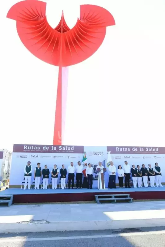 Villarreal Anaya explicó que, con este histórico evento, se ponen en marcha 35 rutas con 15 camiones que transportarán más de 215 mil piezas de medicamentos para su distribución constante y efectiva a 289 centros de salud en el estado.