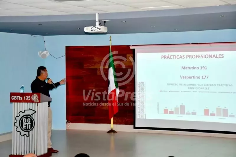 A fin de informar sobre los logros alcanzados durante el ciclo escolar 2024 – 2025, el director del Cbtis 135 en Matamoros, maestro Rolando Cortés Delgado, éste viernes 22 de agosto ofreció su rendición de cuentas e informe de actividades en la sala audiovisual de esta preparatoria.