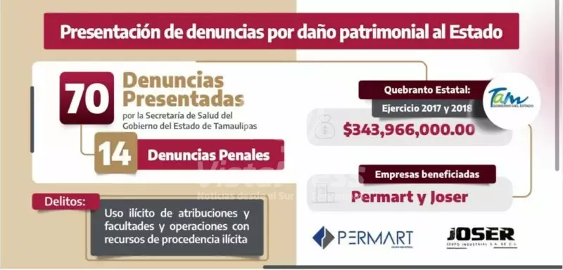 En rueda de prensa, el director jurídico de la Secretaría de Salud, Iván Saldaña Magaña, informó que en total se han integrado 70 denuncias contra el exmandatario y sus colaboradores, relacionadas con un daño al erario de 221 millones de pesos estatales y 122 millones de pesos federales.