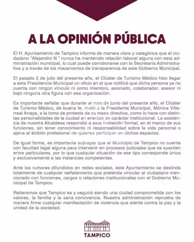 Tampico, Tamps.– El Gobierno Municipal de Tampico, encabezado por la alcaldesa Mónica Villarreal Anaya, aclaró mediante un comunicado oficial que el ciudadano identificado como Alejandro N. no ha mantenido relación laboral alguna con la administración local, ni como empleado, asesor o colaborador externo.