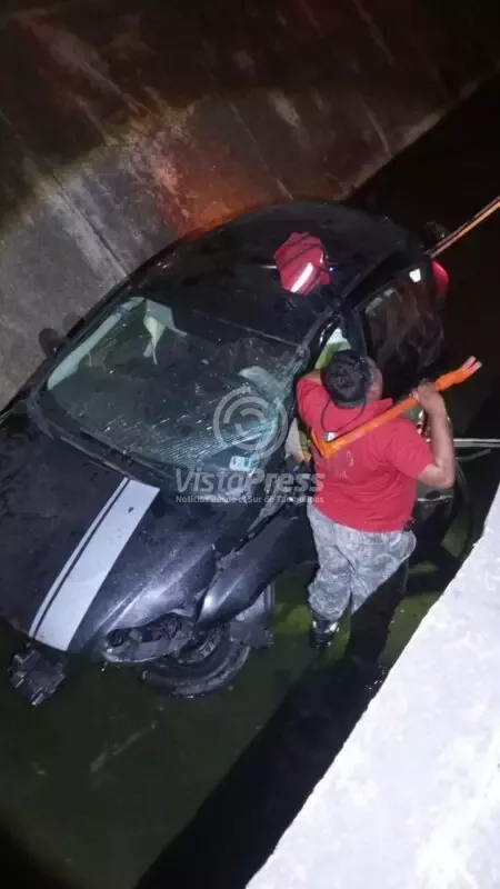 Madero, Tam.- Un conductor resultó lesionado luego de que el vehículo en el que viajaba se precipitara a un canal a cielo abierto tras chocar en la entrada al fraccionamiento 18 de Marzo, durante la madrugada de este domingo.