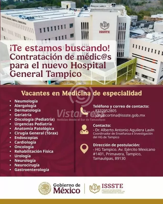 Quienes deseen integrarse a la gran familia ISSSTE pueden comunicarse al 833 295 2805 con el coordinador de Enseñanza e Investigación del Hospital General Tampico, Dr. Alberto Antonio Aguilera Lavín. También pueden enviar su información al correo xm.bog.etsssi@anitroc.egroj.