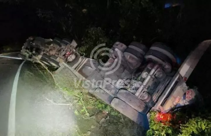 Chalma, Ver.-Una pipa cargada con hidrocarburo, terminó volcada en la madrugada; hechos registrados en la carretera México – Tampico.