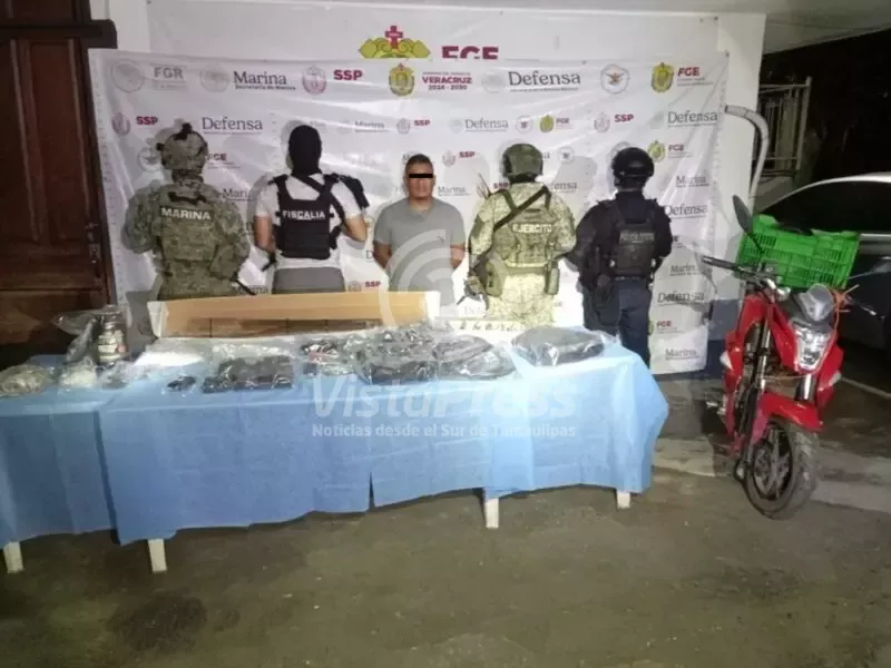 Asimismo, en Pánuco, se aprehendió a tres personas, entre ellas una mujer, a quienes les fue asegurado armas de fuego largas y cortas, una granada de fragmentación, cargadores, chalecos tácticos, placas balísticas y aros aprehensores, así como gorras con leyenda alusiva a un grupo delictivo.