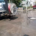 Mientras que en la calle Durazno esquina con Guayaba del Fraccionamiento Los Mangos, se realizó el mantenimiento del colector del sector con apoyo de un camión tipo vactor.