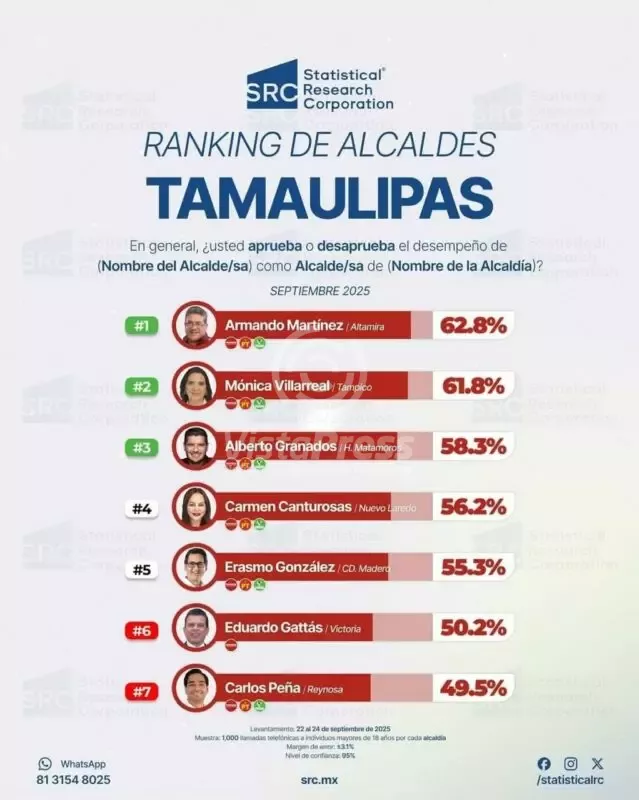 Con una aprobación ciudadana del 62.8%, Martínez Manríquez encabeza el ranking estatal de desempeño, superando a Mónica Villarreal Anaya, alcaldesa de Tampico (61.8%), y a Alberto Granados, de Matamoros (58.3%).
