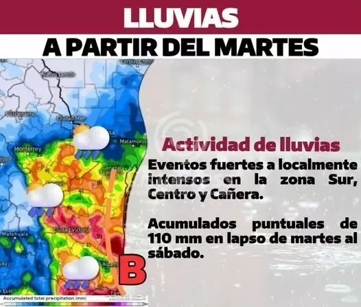 Ciudad Victoria, Tamaulipas .- La Coordinación Estatal de Protección Civil informa, que derivado de una zona de inestabilidad tropical procedente del Golfo de México, ocasionará un periodo de lluvias en el estado de Tamaulipas durante el periodo comprendido del martes 7 al sábado 11 de octubre de 2025, según lo dio a conocer el titular de la dependencia Luis Gerardo González de la Fuente.