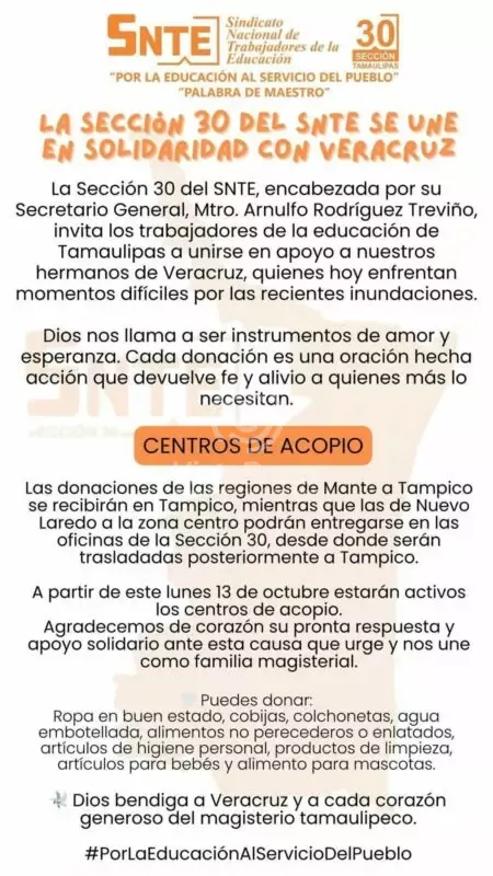 Tampico, Tam.- El magisterio tampiqueño, encabezado por el profesor Rogelio Pérez Lara, secretario de Organización VIII del Sindicato Nacional de Trabajadores de la Educación (SNTE), informó que de habilitó un centro de acopio en la Casa del Maestro de Tampico con el propósito de reunir ayuda humanitaria para las familias damnificadas de Poza Rica, Álamo y El Higo, Veracruz, municipios severamente afectados por las recientes inundaciones.