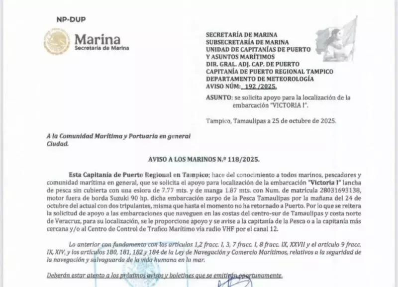 El reporte de extravío se emitió la mañana del 24 de octubre, activando de inmediato los protocolos de emergencia por parte de la Capitanía Regional de Puertos de Tampico, que coordinó las labores de rastreo marítimo y costero.
