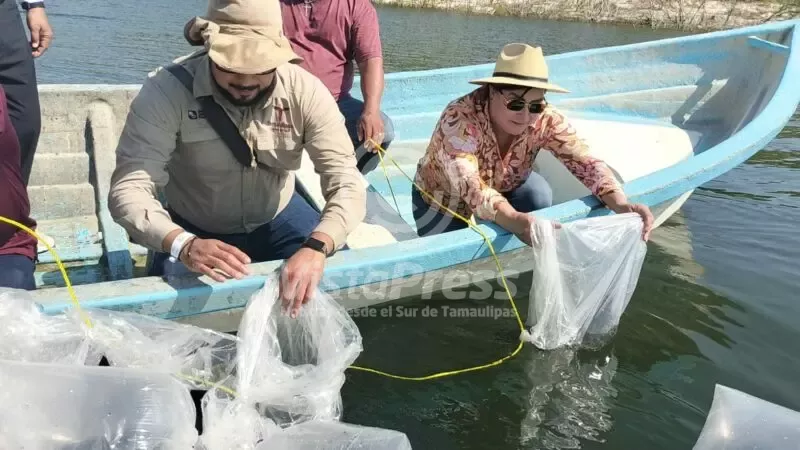 Altamira, Tamaulipas. — La Secretaría de Desarrollo Rural, Pesca y Acuacultura a través de la Subsecretaría de Pesca y Acuacultura, llevó a cabo la siembra de 200 mil alevines de tilapia en el Sistema Lagunario Río Tamesí-Champayán del municipio de Altamira y en la Presa Marte R. Gómez de Camargo, con el objetivo de garantizar la sustentabilidad de los recursos acuáticos y mejorar las condiciones de producción de las comunidades pesqueras del estado.