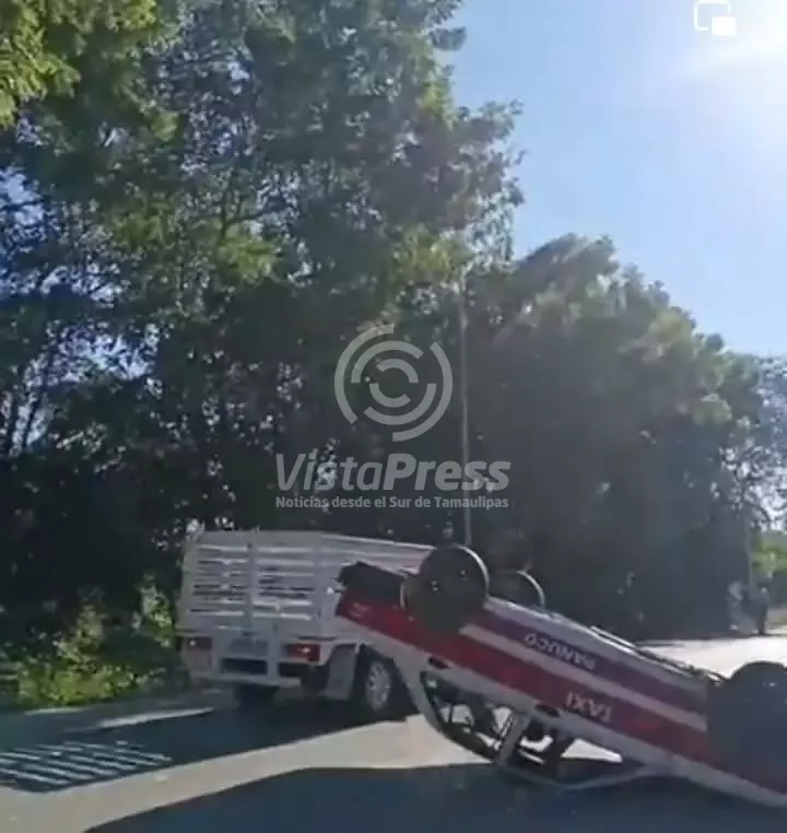 Pánuco, Ver.-Un accidente automovilístico dejó como saldo una persona lesionada y cuantiosos daños materiales, luego de que un taxi se impactara contra un tractor y terminara volcado sobre la carpeta de rodamiento.