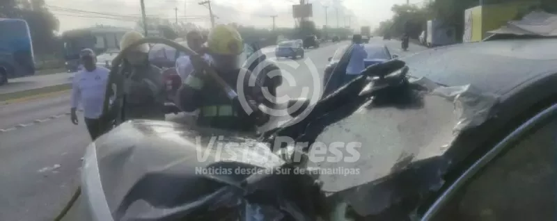 El percance se registró a la altura de la empresa Petrocel, en dirección al centro de Altamira, apenas unos metros del lugar donde minutos antes otro vehículo se había estrellado contra la estructura de un registro de la CFE, hecho que dejó dos lesionados.