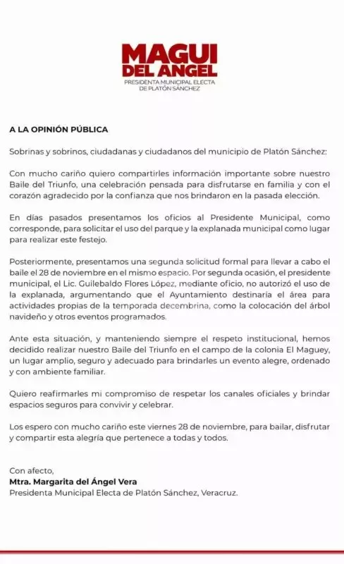 Platón Sánchez, Ver.- El alcalde de Platón Sánchez, Guilebaldo Flores López, negó el uso de un espacio público, solicitado por la alcaldesa electa Margarita del Ángel Vera para realizar un baile de celebración por su triunfo.