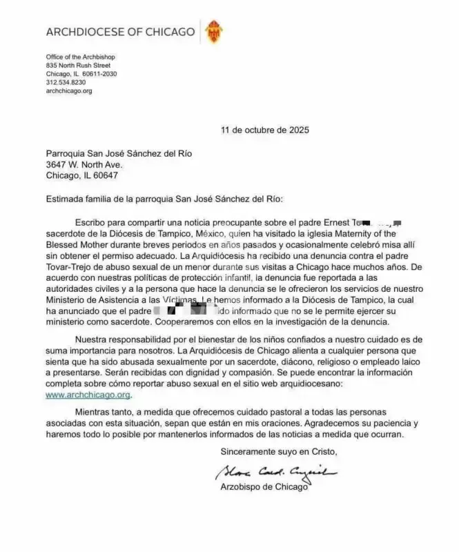 De acuerdo con una carta oficial emitida el 11 de octubre de 2025 por el Arzobispo de Chicago, Blase Joseph Cupich, la Arquidiócesis recibió una acusación por presunto abuso sexual de un menor ocurrido “hace muchos años” durante las visitas del sacerdote a esa ciudad. En cumplimiento de los protocolos de protección infantil, la denuncia fue notificada de inmediato a las autoridades civiles y a la persona denunciante se le ofreció apoyo a través del Ministerio de Asistencia a las Víctimas.