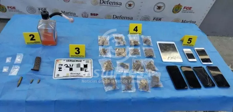Durante el apoyo a un cateo encabezado por la Fiscalía General del Estado en Emiliano Zapata, se aseguraron 16 bolsas de hierba verde con características similares a la marihuana, cuatro dosis de una sustancia con características del cristal, cargadores, cartuchos útiles, teléfonos móviles, una tableta electrónica y una motocicleta sin reporte de robo.