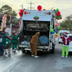 Durante el recorrido, los camiones recolectores fueron decorados con motivos navideños, globos y música, mientras que los trabajadores entregaron dulces y obsequios a niñas y niños a su paso.