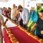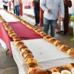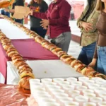 Este pan tradicional preparado de manera artesanal contó con una longitud de 20 metros y está compuesta por un aproximado de 40 barras de rosca horneadas de manera individual en la panadería del centro.
