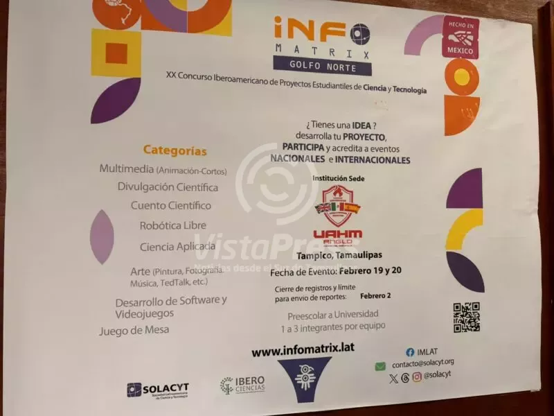 Tampico, Tan.- La ciudad de Tampico fue anunciada como sede del XX Concurso Iberoamericano de Proyectos Estudiantiles de Ciencia y Tecnología, Infomatrix Golfo Norte, que se llevará a cabo los días 19 y 20 de febrero, consolidándose como un punto estratégico para el impulso a la innovación y el talento juvenil en la región.