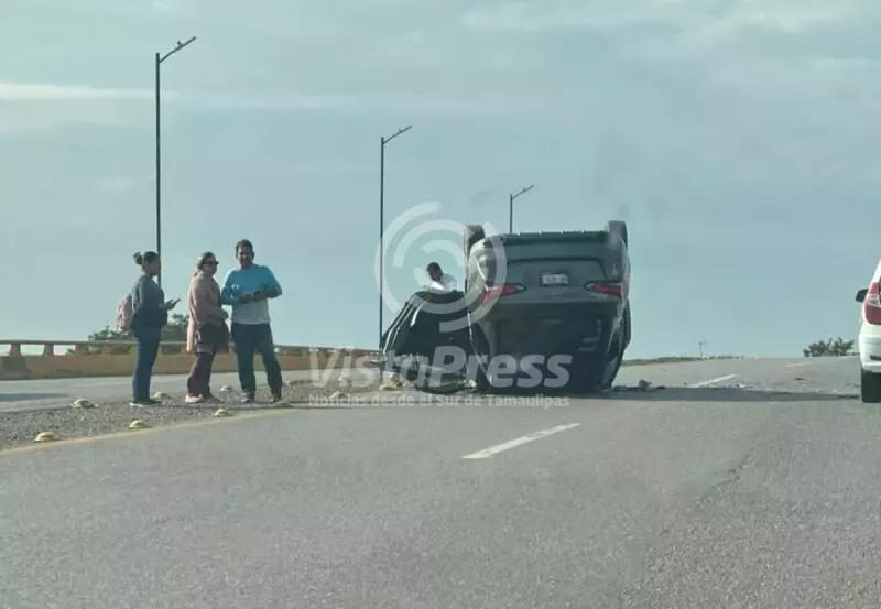 Altamira, Tam.- La mañana de este viernes, un automóvil terminó volcado tras impactarse contra un objeto fijo sobre el puente “El Edén”, lo que provocó una intensa movilización de cuerpos de emergencia y autoridades viales.