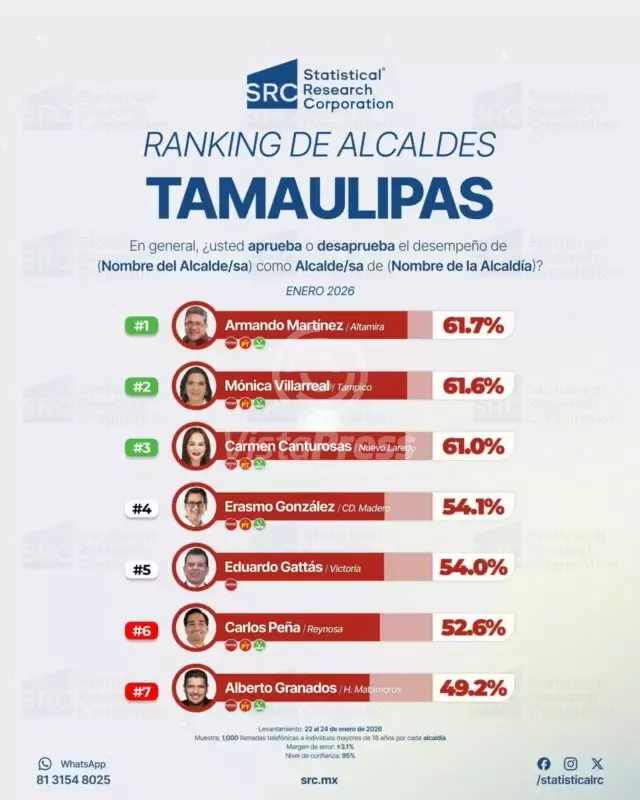 La medición correspondiente al Ranking de alcaldes de Tamaulipas 2026 confirma el liderazgo del edil altamirense, quien encabeza la lista estatal con la mayor calificación ciudadana, superando a sus homólogas Mónica Villarreal Anaya, de Tampico, y Carmen Canturosas, de Nuevo Laredo.