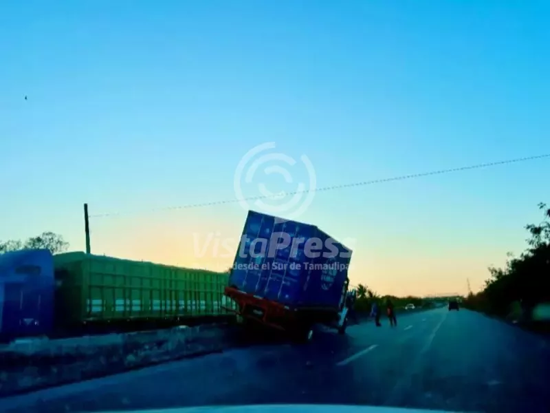 Pánuco, Ver.-Un camión con contenedor terminó ladeado de forma peligrosa, tras treparse a un muro de contención de concreto, en la carretera Tampico – Valles cerca del puente Tamós.
