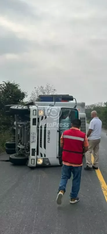 Platón Sánchez, Ver.-La volcadura de un camión repartidor de salchichas, dejó como saldo el conductor lesionado y elevadas pérdidas materiales.