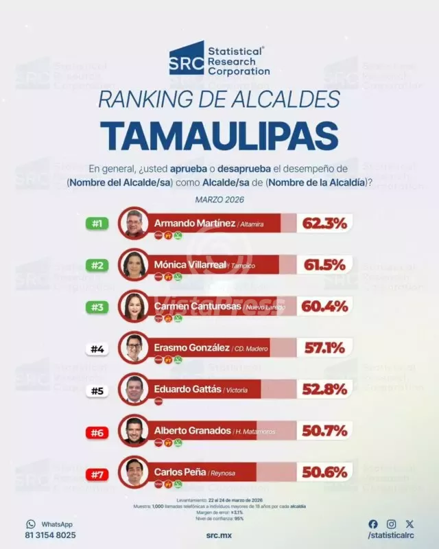 Según el Ranking de Alcaldes de Tamaulipas, elaborado por la firma Statistical Research Corporation, el edil altamirense se posiciona en el primer lugar en aprobación ciudadana, alcanzando un 62.3 por ciento. La medición se basa en la opinión de los habitantes respecto al desempeño de sus autoridades municipales.