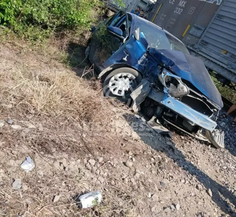 Pánuco, Ver.-Hace unos momentos, se registró un percance vehicular donde un tren embistió a un automóvil de la marca Chevrolet tipo Aveo color azul modelo 2020, justo en el acceso que conduce al balneario denominado Lagartomanía, entre los poblados de Moralillo y Tamos.